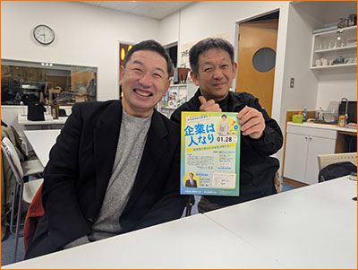 眉山倫理法人会より庄野章夫氏、あわ倫理法人会より寺岡健介氏の両会長をお迎えしての60分。倫理!と聞いただけで後ろを向いてしまう、んなモン腹の足しにもならん、一生縁がない・・・まったくその気のない林にとってどうやって番組を進行したらいいんだろ?重い空気が漂っていたが、両会長の落ち着き払った態度に、一安心!アシスタントはなつきさんだが、笑っているだけ。ま、いいか!!法人会の名前の如く、会員さんは経営者がほとんど。ということは企業を維持するために、従業員の生活を安定させるためにも、経営者はその前向きな心構えを明確にしなければならない。その観点から事業繁栄のヒントを提案してくれるのが倫理法人会だそうな。要するに(企業は人なり)!朝6時からモーニングセミナーなる、林にとっては拷問のようなセミナーを毎週開催、まずは生活態度から見直す・・・それだけで林はギブアップだが!経営者の人間性、人間力に着目し、(企業は人なり、経営者が変われば会社は変わる)をテーマに倫理経営の観点から事業繁栄のヒントを探る のが倫理法人会也!!その縁のない団体の合同倫理経営講演会の懇親会に林は演奏の依頼を受けたのである。相棒は石川美智子姐、ジャズからポップスまで30分程度の演奏。曲にしてだいたい6曲か!美智子姐は客の顔やら反応を見て、曲やそのサイズ決めようか、だと。それはなんとかなるにしても、曲の前奏が2〜4〜8小節と気分によってコロコロ変化するのである。先日のしんまち街角音楽祭では前奏8小節だと安心しきっていた林を4小節で入って見事置いてけぼりの実績がある。それを聞いていた両会長は、ひとこと(楽しみだわ!)要するに美智子姐には逆らえないのである。どうなることやら!!楽しみでもある。1/28(水)18時より体験報告、講演、懇親会とある。気が向いた人は倫理法人会のHPで検索してみてはいかが?なにか得るものはあるはず!!