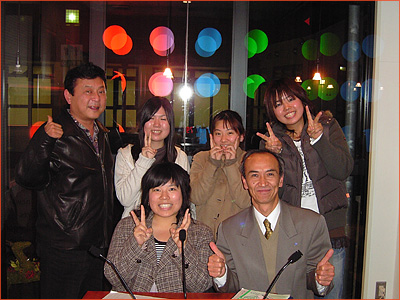 本日のお客様は岡田住建社長の岡田和史氏、競艇界のマドモアゼル岸恵子氏、その友人のなおちゃん。放送終了10分前に到着のチャッピー浅田千亜希氏。洗濯物を取り込んでて遅くなったらしい。悪党み〜なはなんと放送1分前にB−FMに到着、スタジオにドカドカ悠然とやってきたのが放送開始5秒前。3週間ぶりにやってきたというのに、そのふてぶてしさは変わらない。