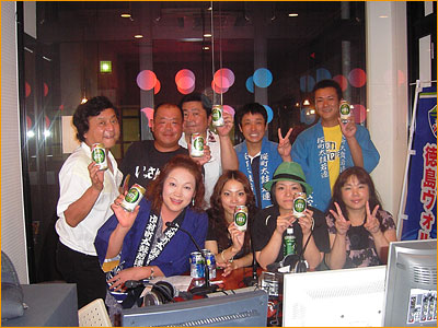 日和佐八幡神社氏子青年会のドン大城一樹氏、副頭領の喜和田あつし氏、1番太鼓責任者の西口みつのり氏、野田ジョージ氏、ギャル御輿代表の松本こずえ氏、篠原まこ氏、そしてキャサリンの7人がお客様。それに悪い病原菌に冒されていた悪党み〜なが1ヶ月ぶりに復帰。親父と巨体とデブと若者とお嬢様が入り交じってスタジオは熱気ムンムン!!クーラーは稼働してるのに外のほうが涼しい!!