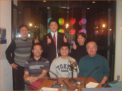 お客様は本家大名連より、鳴り物リーダーの谷本氏、作曲家の菅氏、太鼓のゆえさんの3人。4/3がお花見ライブなので、そのMC補助担当がゆえさん、で、打ち合わせを兼ねての出演、で、お仲間を引き連れての登場となった。ゆえさんは、数回出演しているのに、普段の天然すっとぼけた雰囲気ではなく、なぜか緊張の極致。手元には阿波踊りのこと、本家大名連のこと、イベントのこと、お花見ライブのこと等々原稿を10枚ほど束ねての参戦。が、ディレクターK氏は(甘いわ!)と一括。(何回林さんの番組出てるんだ?んなもん無駄ってわかってるでしょが)だと。ということで、手元には連員募集!の連長電話番号記載のメモ1枚だけが残った。